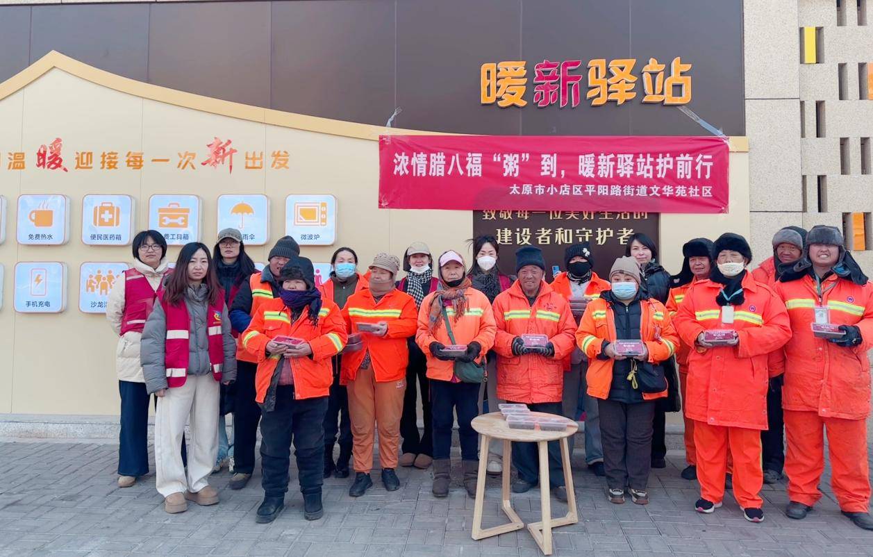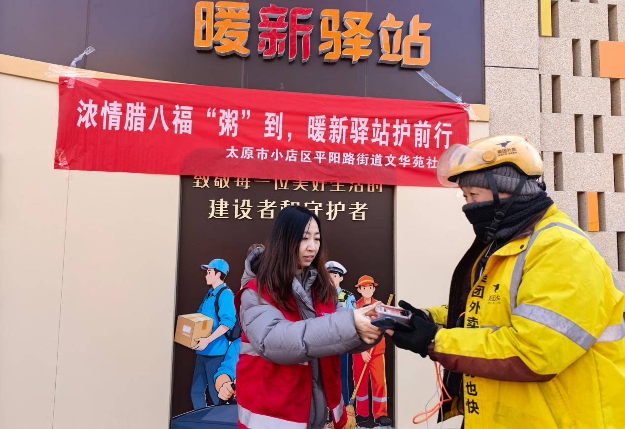 公益在线太原讯(记录者 范继东)腊月初八寒冬至,一碗福粥暖人心。为传承中华优秀传统文化,切实关怀户外劳动者与新就业群体,2026年1月23日,太原市平阳路街道文华苑社区暖新驿站携手辖区爱心门店悦州渔庄,共同举办“浓情腊八福粥到,暖新驿站护前行”主题活动,为奔波在一线的快递员、外卖骑手、环卫工人等群体送上热气腾腾的腊八粥与节日祝福。