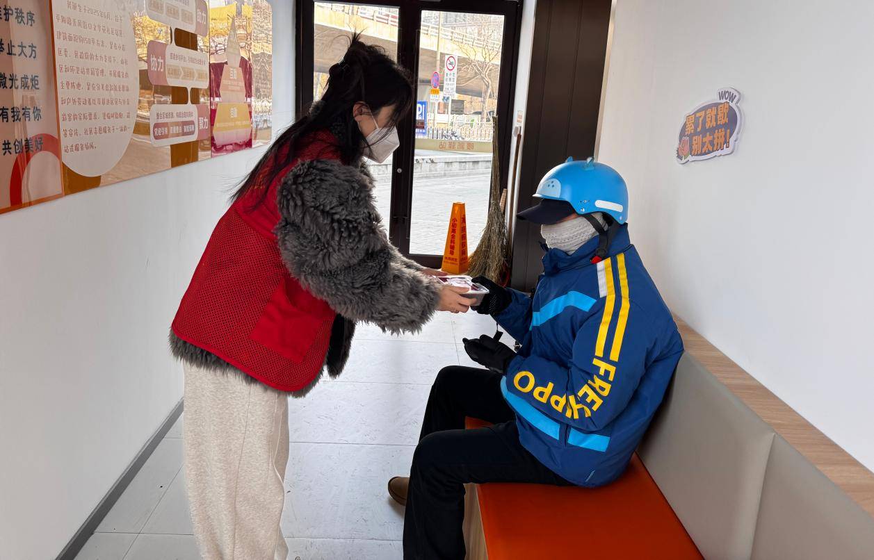 一大早工作人员便来到门店,分工明确,默契配合,快速完成分装、打包,送往暖新驿站。在驿站门口,工作人员们将一份份热气腾腾的腊八粥送到正在忙碌的外卖骑手、快递小哥、环卫工人手中。“每天早出晚归赶时间,没想到社区和商家特意为我们准备了腊八粥,喝下去浑身都暖和了,感觉特别贴心!”刚送完一单外卖的骑手王师傅捧着粥碗,脸上洋溢着朴实的笑容。环卫工人李阿姨也连连点赞:“驿站平时就给我们提供喝水、歇脚的地方,过节还能收到热粥,真是把我们的冷暖放在了心上。”