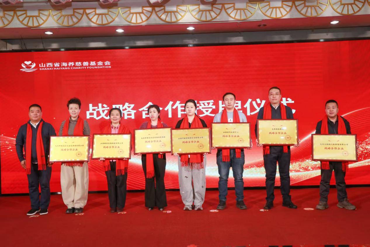 图为与山西海洋慈善基金会签署战略合作爱心企业授牌仪式 【同心·同行】同时,为凝聚更广泛的社会力量,基金会与太原市智尚影视文化传媒、山西椿基生物科技、太原方程豹汽车销售等七家单位现场签署战略合作并授牌。