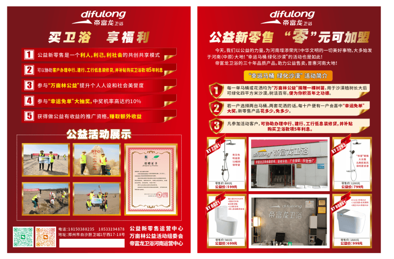 今天,我们以公益的力量为河南增添荣光! 中华文明诸多美好实践,常从河南(中原)大地起步,“幸运马桶 绿化沙漠”公益活动亦是如此。 深秋时节,在河南郑州这片中原沃土上,一场“消费即公益”的创新实践正温暖启幕。深耕治沙公益八年的万亩林公益组委会,近日携手拥有30年品质积淀的广东帝富龙卫浴,正式推出“幸运马桶绿化沙漠”活动——为2017年立下的“十年种植万亩沙漠林”目标,注入全新活力。